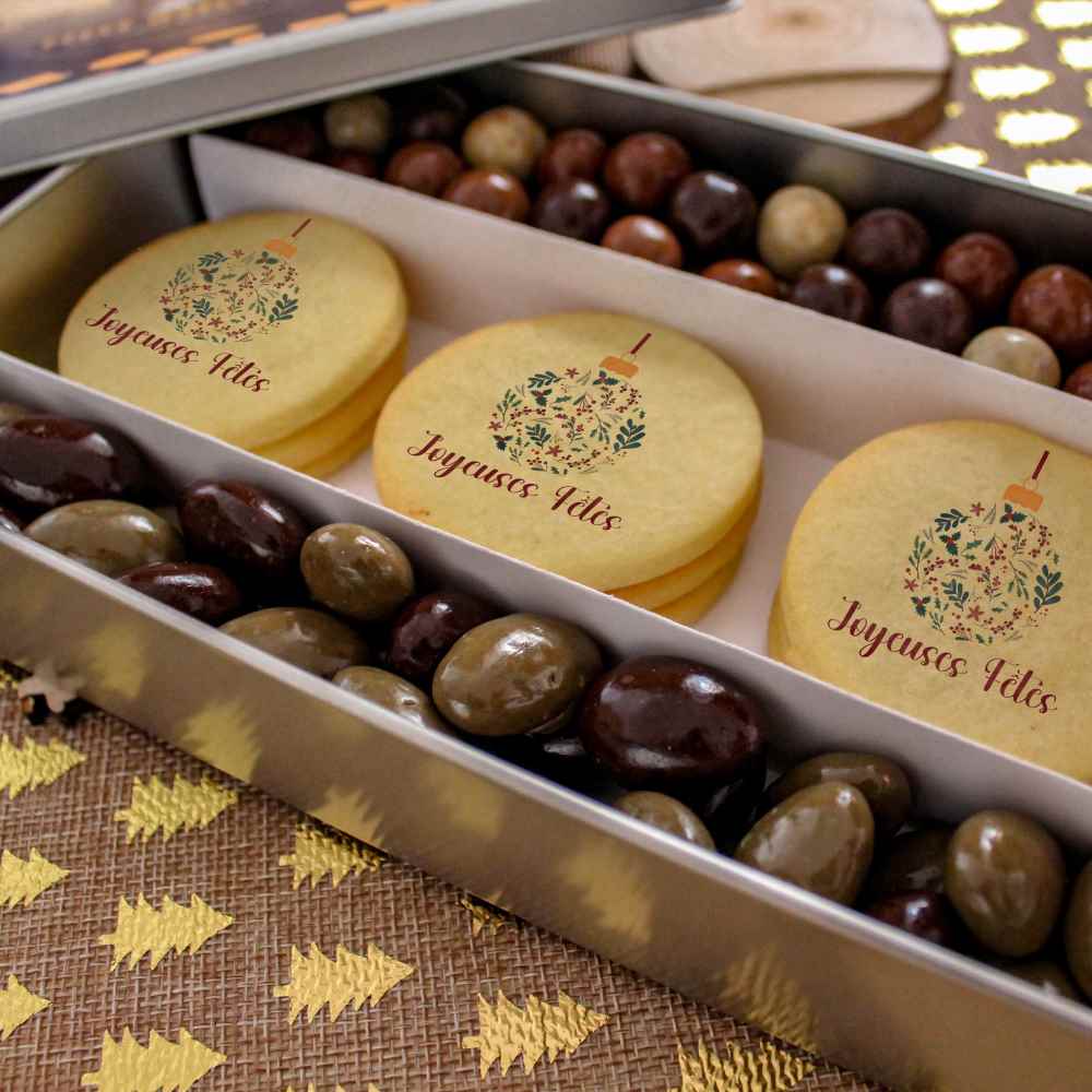 Offrez un cadeau d’entreprise gourmand comprenant 9 biscuits personnalisés artisanaux pur beurre, 130g d’olives au chocolat noir et 100g de croustillant au chocolat sans gluten, le tout dans un élégant coffret en métal. Un cadeau idéal pour remercier vos clients ou collaborateurs pour les fêtes de fin d’année.