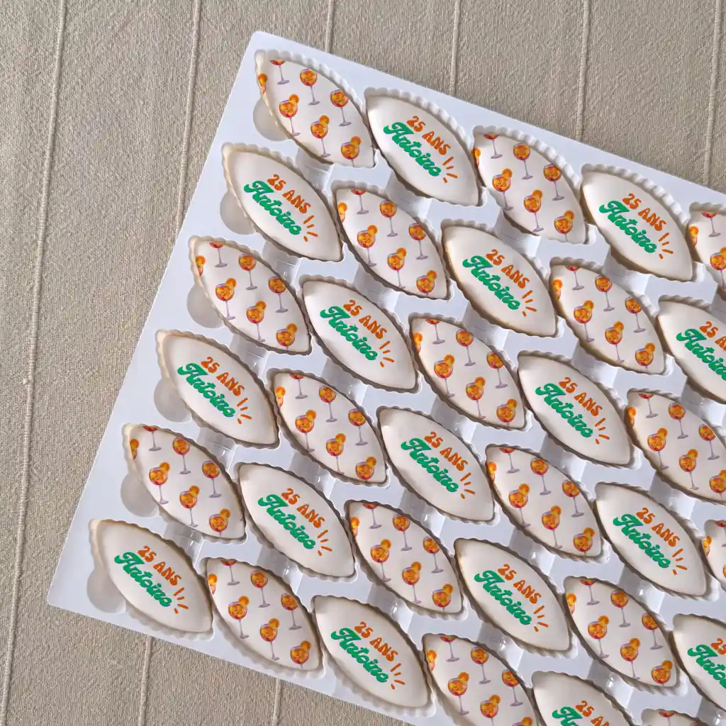Chaque calisson est imprimé avec votre texte personnalisé et présenté dans des plaques alvéolées qui facilitent le transport et la mise en place. Disposez-les directement sur un buffet, une table de fête, ou dans vos propres contenants pour un cadeau invité d’anniversaire unique !