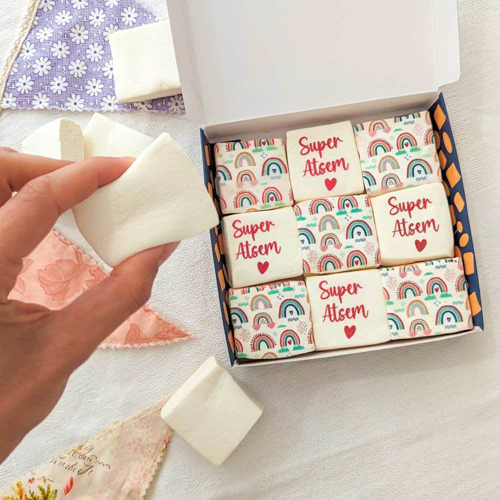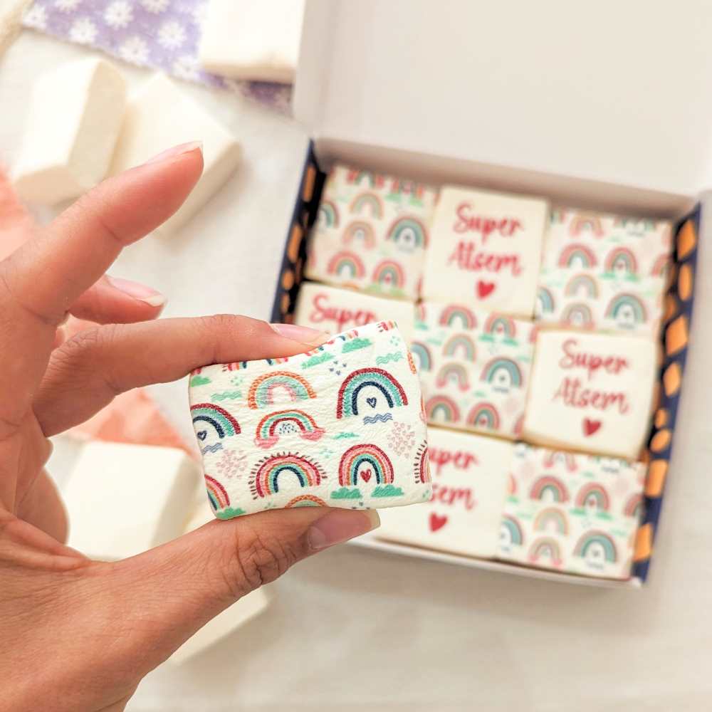 50% des guimauves sont décorés de motifs arc-en-ciel🌈+ 50% avec le message de votre choix.