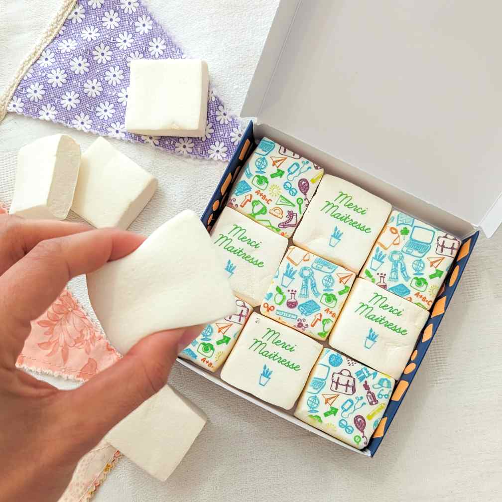 La fin d’année scolaire approche, et avec elle, l’envie de dire “Merci maîtresse” de façon originale, tendre… et gourmande ! Ce coffret de 9 guimauves personnalisées est une jolie alternative aux traditionnels gâteaux ou cadeaux classiques. Il apporte ce petit effet “whaou” qui fait plaisir à coup sûr !